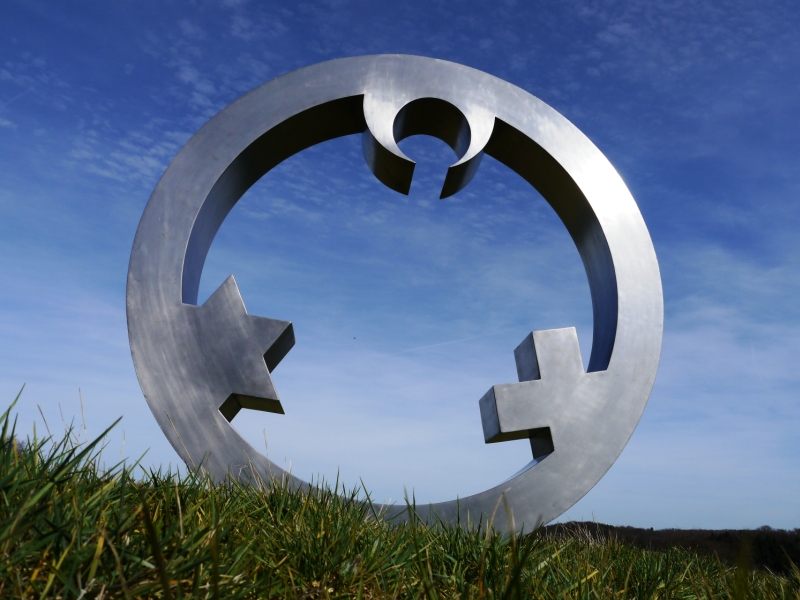 Die Zeichen der drei abrahamischen Weltreligionen stehen hier stellvertretend für alle Kulturen und Religionen. So tauchen sie nur unvollständig aus dem umgebenden Ring auf, die komplette äußere Form wird erst durch die innere Wahrnehmung des Betrachters sichtbar, dazwischen, dahinter ist die ganze Vielfalt der Kulturen vorstellbar.